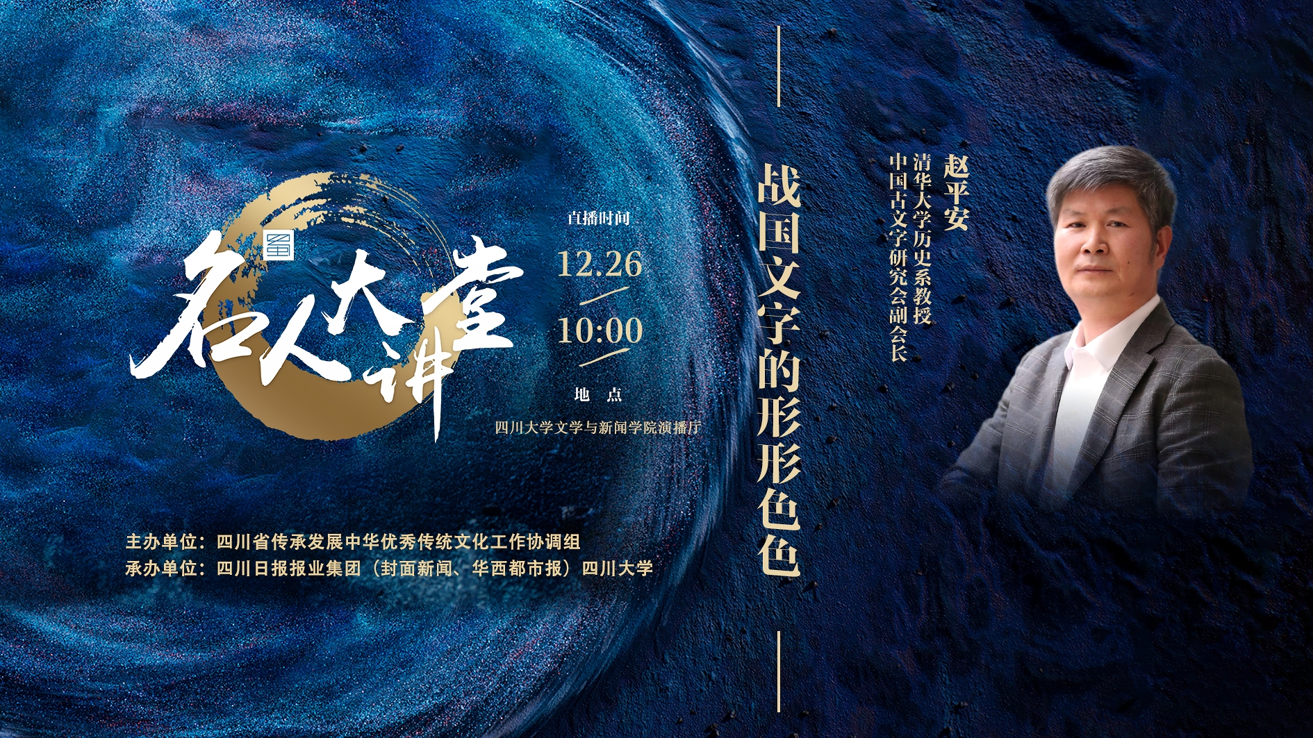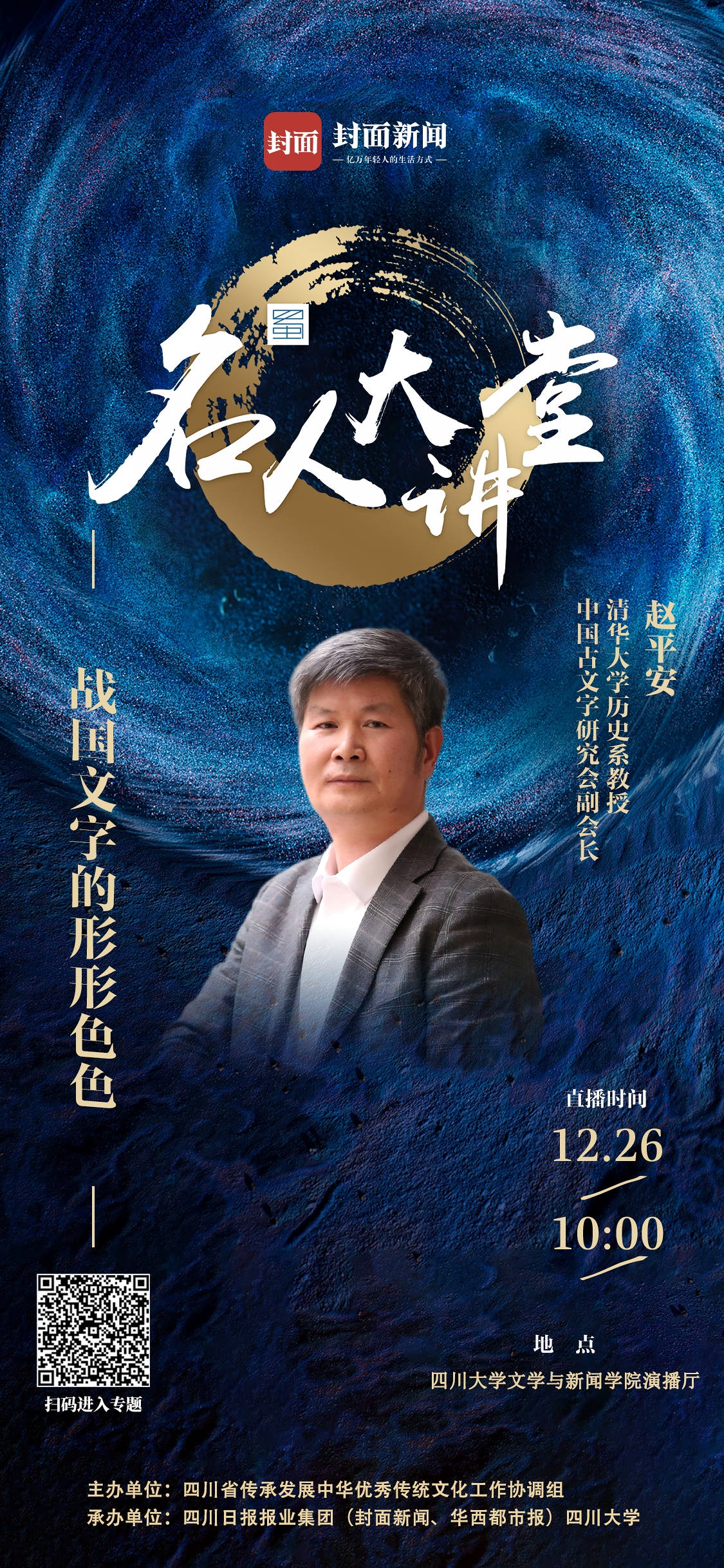 12月26日上午10点,清华大学历史系教授赵平安,将做客2025名人大讲堂“汉字源流”季,在四川大学文学与新闻学院演播厅开讲,为现场师生及线上网友带来题为《战国文字的形形色色》的学术讲座,带领听众穿越时空,解密战国文字背后的重要意义。